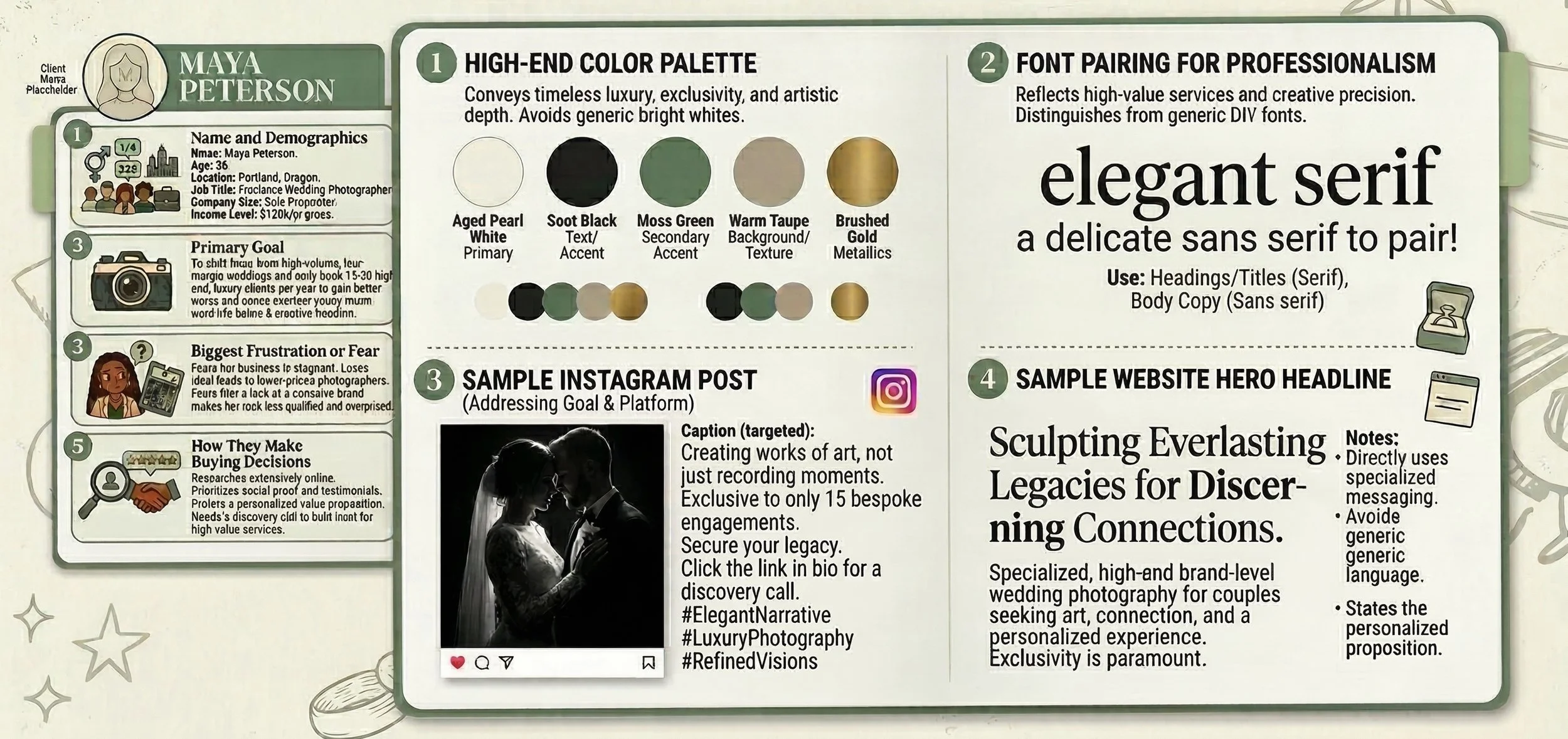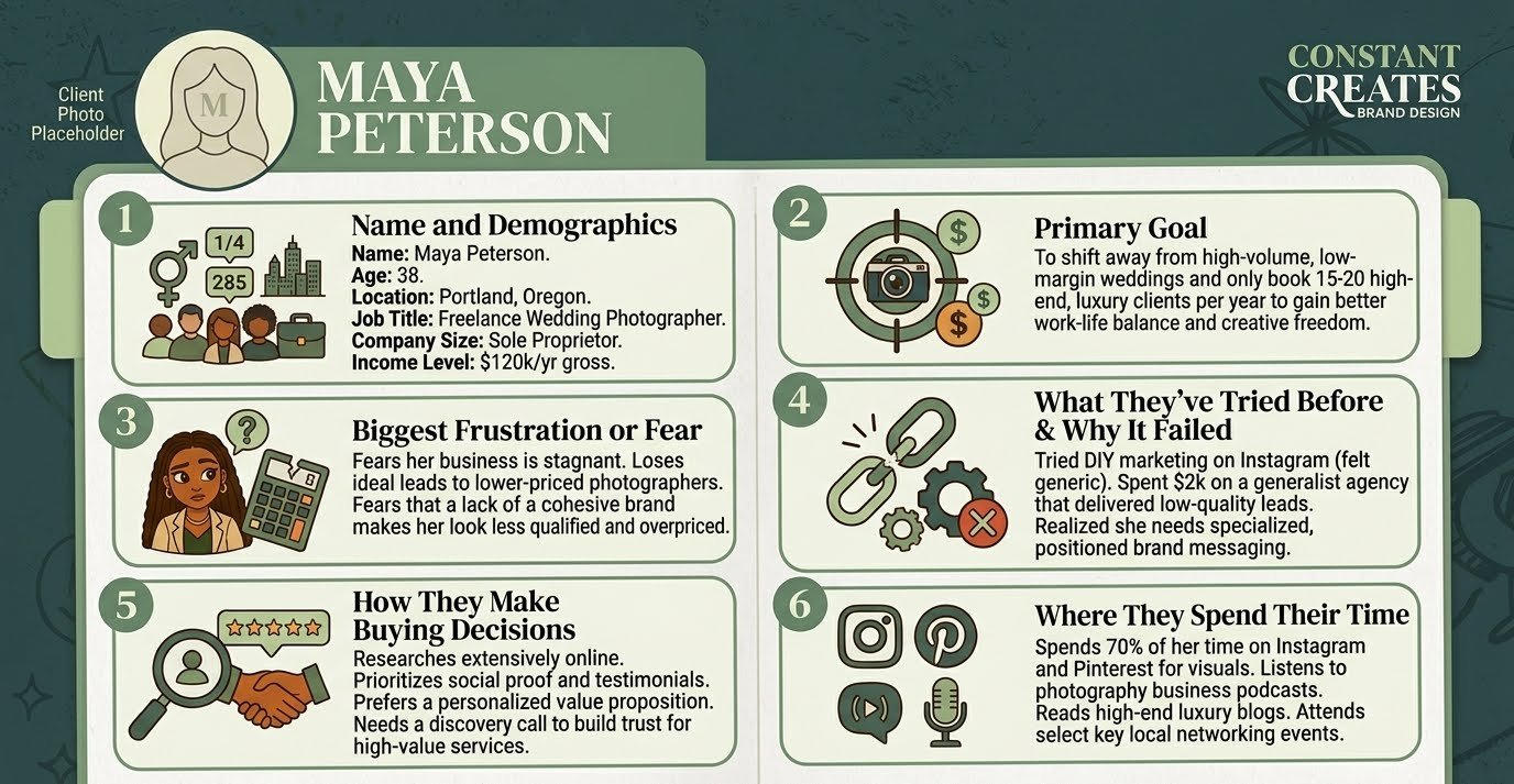 Their biggest frustration or fear. What pain point makes them look for help? A small business owner might fear insufficient marketing knowledge or losing visibility to competitors. A service provider might fear looking overpriced. A professional might fear not being qualified enough. These emotional drivers are the foundation of effective brand messaging and inform your brand strategy.