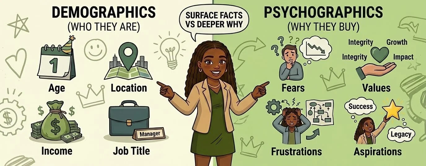 The psychographic question that unlocks everything: What keeps them up at night? Not literally, but what frustration, fear, or challenge makes them search for a solution? A financial advisor's ideal client might be kept up by taxes. A marketing strategist's by losing clients to competitors. A therapist's by anxiety.